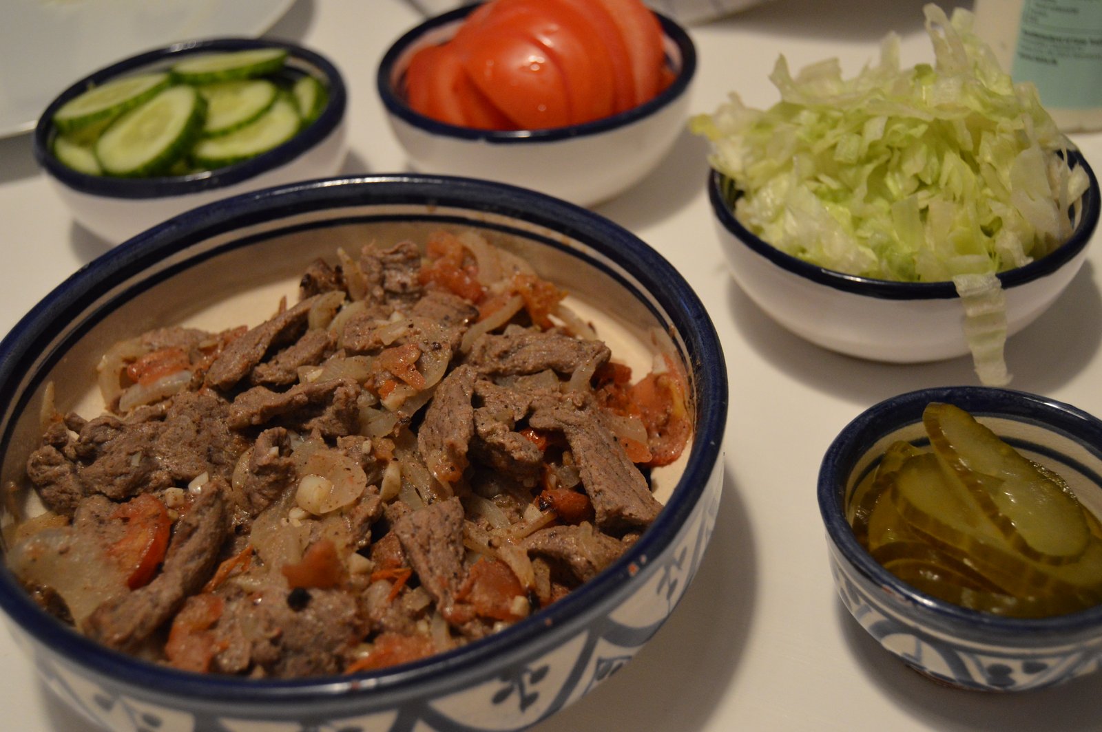 Spises i arabisk brød med tomat, salat, agurk, dressing eller hvad man ellers lyster.